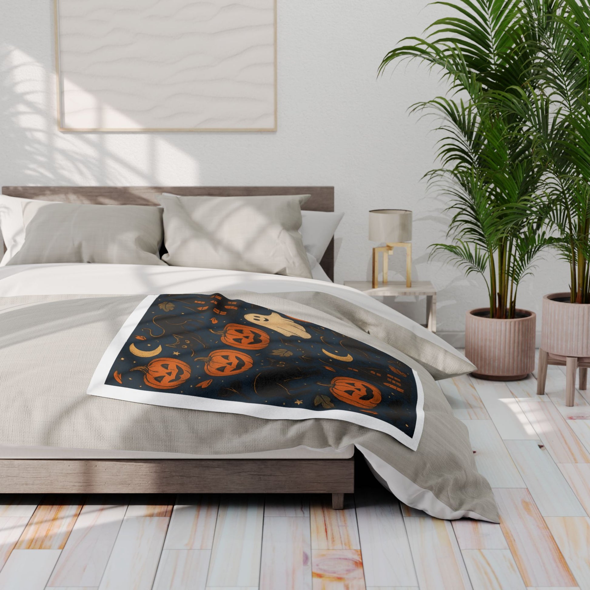 Halloween Themed Fleece Blanket, Cozy Spooktacular Decor, Pumpkin and Ghost Design, Perfect for Fall Celebrations, Gift for Cat Lovers